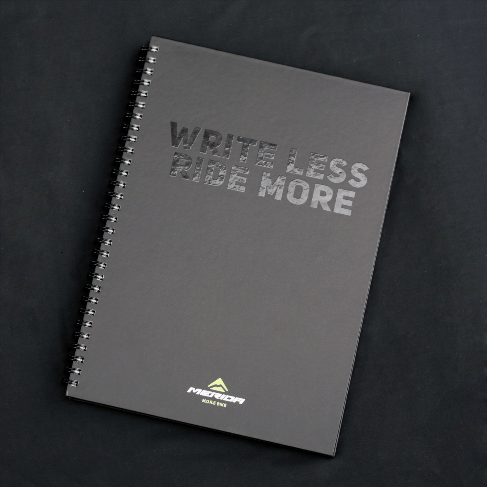 重厚感のある表紙には、マットな質感の背景に「WRITE LESS RIDE MORE」のメッセージをグロス(光沢)プリントで配置。洗練されたコントラストが際立つデザインに仕上げました。