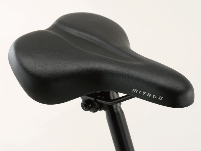 ミヤタが新たに採用するフラットワイドサドルは、幅広で体重をしっかりと支え、平らな座面が座りやすい形状です。